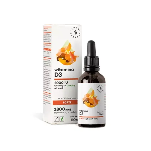 Aura Herbals Witamina D3 Forte to suplement diety w kroplach, zawierający 2000 IU witaminy D3 w jednej kropli. Produkt został stworzony na bazie lanoliny oraz oleju MCT z kokosa, co zapewnia prawidłowe wchłanianie bez konieczności spożywania dodatkowych tłuszczów. Jedna butelka zawiera aż 1800 dziennych porcji.